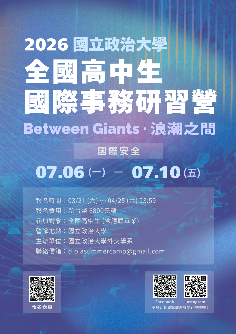 3 | 國立政治大學 | 全國高中生國際事務研習營 | 115/4/25 | 115/7/6~115/7/10 | |